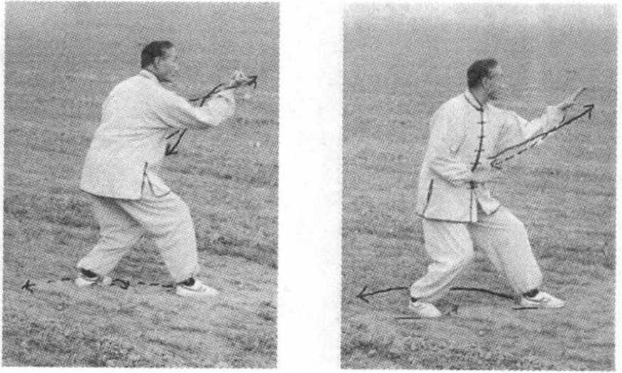 (3) 上式不停,右脚稍里扣,左脚后退一步,重心偏于左 腿,两腿仍微屈;同时,右掌前插,高与鼻平,左掌捋按屈肘