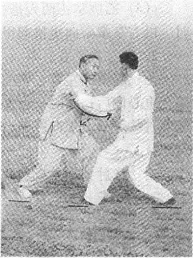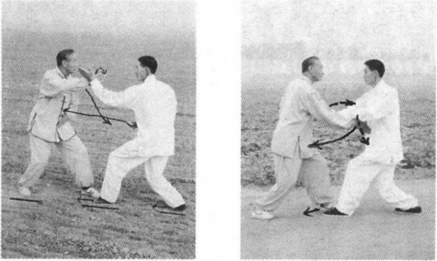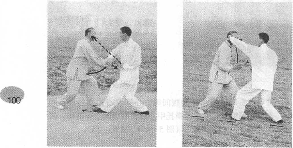 在甲的右拳即将击住胸腹间时,乙即翕身左脚后撤;同 时,右掌抽回变拳,左掌里横托甲右肘,右拳随左脚前移,两 腿屈膝,向甲的右肋部猛击(图5-154、图5-155)o