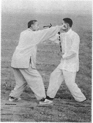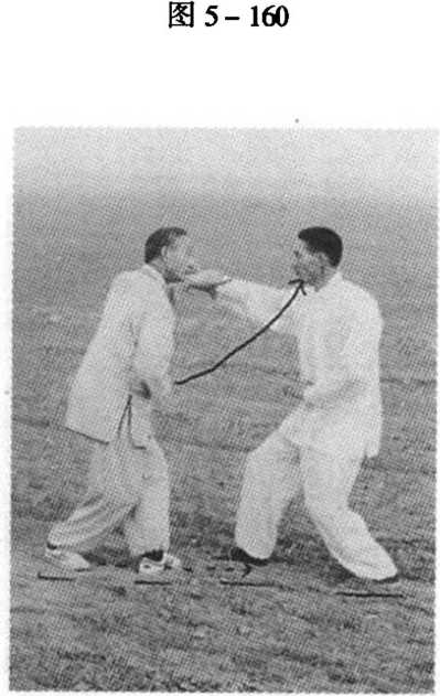 甲以右拳击乙之左太阳 穴位,乙将左脚后撤外摆, 身向左转;同时,以左拳变 掌随身转格压甲之右拳,随 后撤回脐前,并即时上右 步;同时,右掌变拳内旋, 以拳背击甲之左太阳穴位 (图 5-161、图 5-162)。