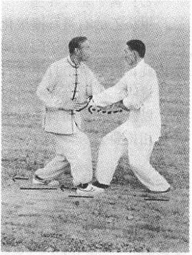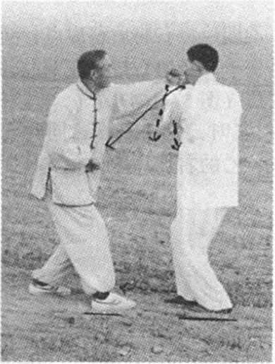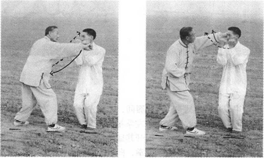 说明:乙用左拳击甲之右太阳穴时,身要右扭,同时含 胸,以腰胯之拧劲贯之以拳,其次,乙的右贯耳捶与左贯耳捶 动作相接要紧。