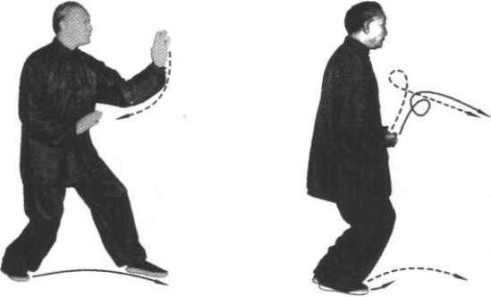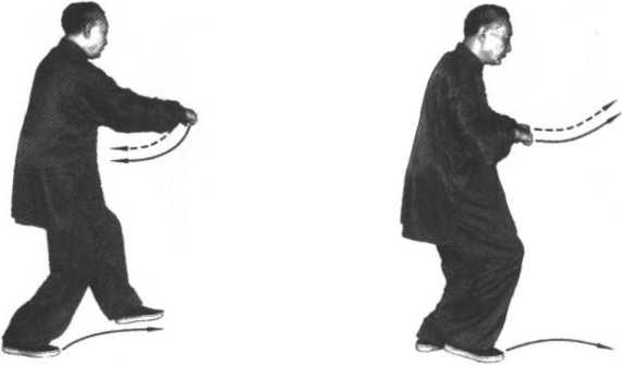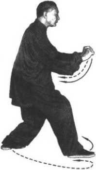 上述“单马形右势”回身到起势点时,双拳抱于腰侧,并将 左脚后撤,接着再迈出成三体式步;同时,双拳变掌伸出,还原 为三体式。