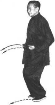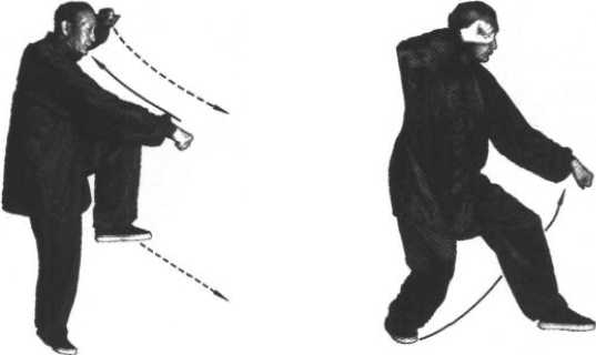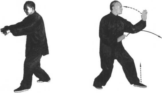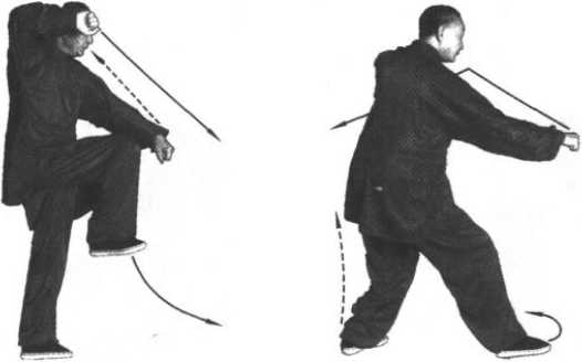 在打完“单马形右势”回身后,首先右脚微提里扣,身向左 转体180°;同时,随转身左腿屈膝上提,成右独立势,其余动作