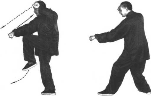 左腿上提要与双拳动作一致,左脚落地要与双拳动作协调, 上下左右动作配合协调连贯,一气呵成。此为督脉之劲,它体现 拳膝配合,顾下打上。这是马形的又一练法,余与双马形同。