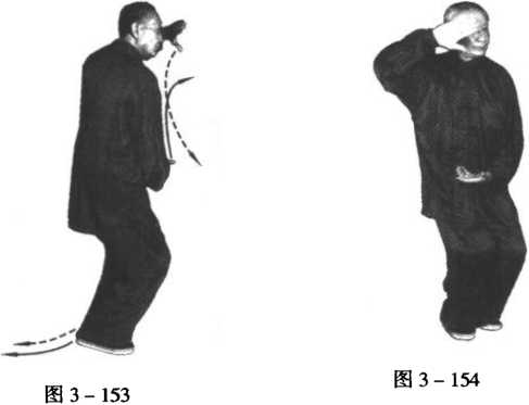 接上式,右脚向右斜后方撤一步,左脚亦随着前蹬向后撤, 脚掌点地,停于右脚内侧,两腿稍屈,成左丁步,重心偏于右 腿,其余上身动作与“左退步16形”相同,只是左右方向相反 (图 3 - 154)。