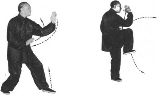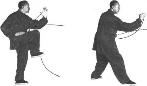 右脚上步并向前纵跳与左腿上提要一致,同时要与上体双掌 动作协调;双掌上托下捋与肘膝上下配合要默契,支撑腿微屈而 稳固,保持身体平衡,此属任脉劲。在左脚落地后双手缩抓,要 迅速接连击出,此属督脉劲。要求头正、肘垂、缩胯、翕身、收 臀,掌握重心;显示鸡之独立、纵跳、争斗、啄食之特长。此形 主练中节肘、膝之用法,即远用手脚,近用肘膝。