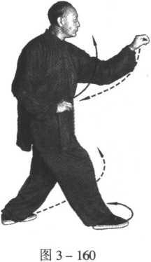 左脚向前垫步,紧接着脚掌尽力后蹬,余与“右独立势纵跳鸡 形”完全相同,只是方向相反(图3 - 158、图3 - 159、图3 - 160)。