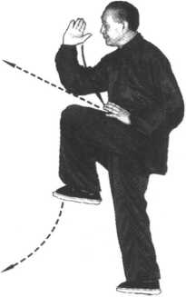 (1)右脚向前上一步,紧接着脚掌尽力后蹬,身略前俯,膝 微屈,向前纵跳一步;左腿立即屈膝在身前提起,大腿略高水 平,脚尖上勾,膝向里摆,成右独立势;同时,身略左拧,左掌 后捋,屈肘抽回,掌心朝下,停于腹侧;右掌屈肘塌腕由腹侧与 左掌交叉经胸前上托,掌心斜向上,掌外缘向前,手指稍内扣朝