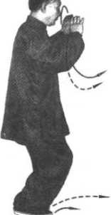 ③ 此形主练臀胯,体现“舶之竖尾之精,捣物之力”。其上 肢动作为封、控、冲撞,下肢为胯部挤靠,此属督脉劲。另一种 练法其不同点是,双掌塌腕横着向前上夹、托,此属任脉劲。这 两种练法,两掌(拳)不宜前伸过脚,掌握中心。其运行路线为 两侧,击、撞对方之肋、腹两侧。拳经曰:“胯打中节并相连, 阴阳相合必自然,外胯好似鱼打挺,里胯抢步变势难”。