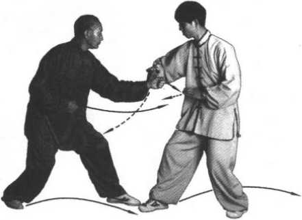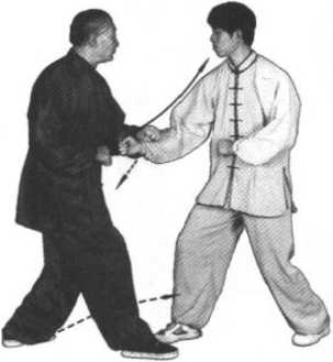 乙以里横 掌化解了拗步 右钻拳,甲将 右臂顺势向上 旋转屈肘抽回 右立拳置于脐 前,解脱了乙 之横击;接着 左脚前进一 步,右脚跟 进,成三体式