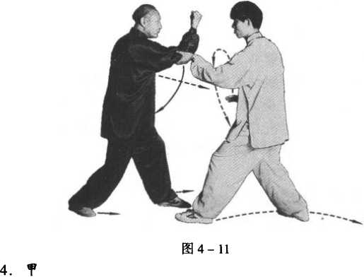 图4-9图4-9图 4一10图 4一10甲用拗步右钻拳击 打面部,乙速即将右脚 后退一步,成三体式 步;同时,身向右扭, 双拳变掌,左掌外旋, 小臂纵平成侧掌,掌指 朝下,掌心向里,向右 横击甲之右臂中节,使 其拳偏离中心;右掌内 旋回抽,掌心向下,屈