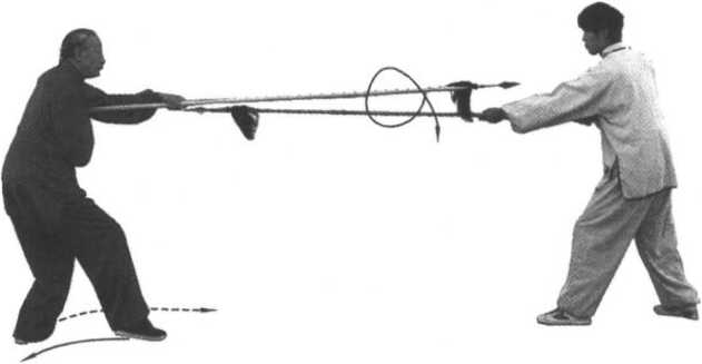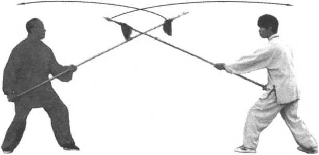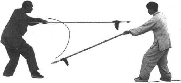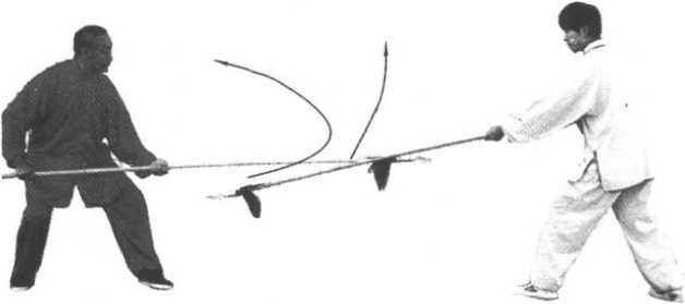在甲上扎枪的同时,乙身起立,并向左扭成三体式步;同 时,亦将枪上拨,与甲的枪前段相交,目视枪尖(同图2-97)o