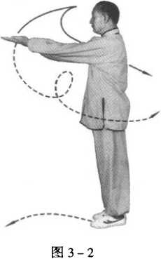 两小臂屈肘上提,掌心向上,由两肋侧直臂向前平伸,目视 前方(图3-2)。