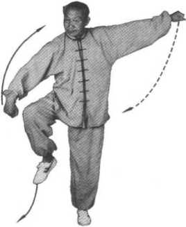 ② 上述动作可左右反复 演练,路线为直趟。在回势 时如是右弓步横击,身向左 转体360°,以右脚为轴,左 脚随体转后撤外摆落在右脚 前面,屈膝半蹲,右腿伸直 随转体稍后摆成左弓步;同 时,左臂先外旋向上弧形横 拨再内旋成侧平举,右拳内