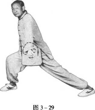 (3) 右弓步横击。上式 不停,右脚外摆向前屈膝落 地,左腿随之后摆,成右弓 步;上肢动作除右拳下挂后侧 横击外,左拳与动作“1”的 左弓步横击相同,只是方位相 反(图3-29)。以下动作与 “2”、“3”相同,只是方位相 反。