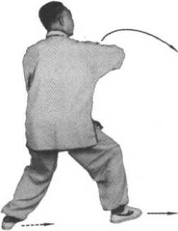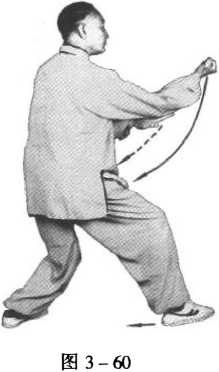图 3-59图 3-59在前脚落地时后脚及时跟 进,并保持两腿之间的距离,重 心稍偏后腿;同时,两掌捋、托 动作要与步法协调。在做顶肘动 作时,前掌稍上托后立即步肘协 调,以双臂合力顶击。