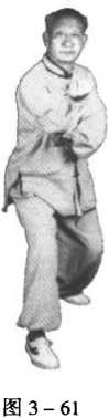 (5) 接上式不停,身微右 扭,右臂伸直,右拳由上向下盖 击,拳心朝上,高与肩平,肘微 屈;左掌前伸,肘稍屈,掌心向 下护于右肘下,目视右前方(图 3-60背面、图3-61正面)。