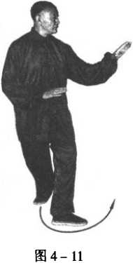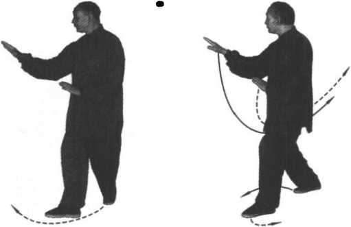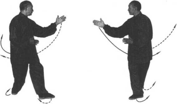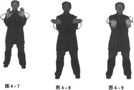 ② 在换势转向时,后手带有缠、绕、拨、捋之意,接着前伸 后则有按冲之劲;虽有其意但不外露而要放松,不可僵滞,在运 行中体悟其理。