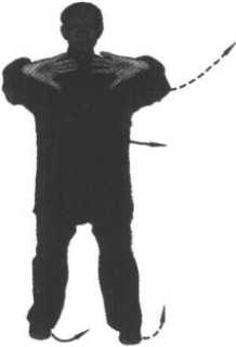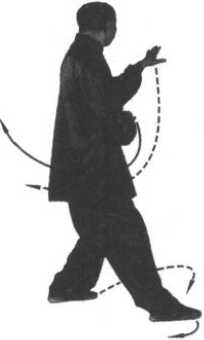 ① 身势要求除同上式外,还要拧腰、裹胯,沿平圆走盘根 步,两脚一摆一扣,平提离地面,互经踝关节处,平稳行步。在 初学时可绕大圈一般每圈走八至十步,以后逐步缩小,可走四至 六步。两掌指端稍扣,掌心回缩,松肩贴背,缓缓行之。此是高 势,两腿微屈,步幅较小,属头、脚之竖劲。