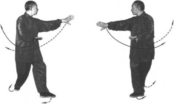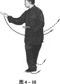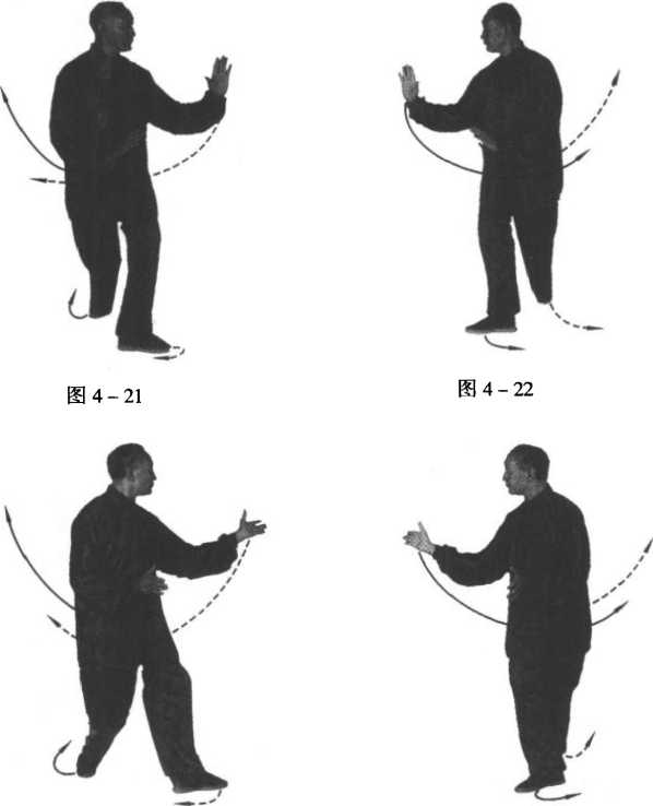 接上式,换势时双掌内旋270。,掌心向外由仰掌换为反掌, 它含有拨、撑、带、捋、掰之意,余与“2”相同(图4-19、