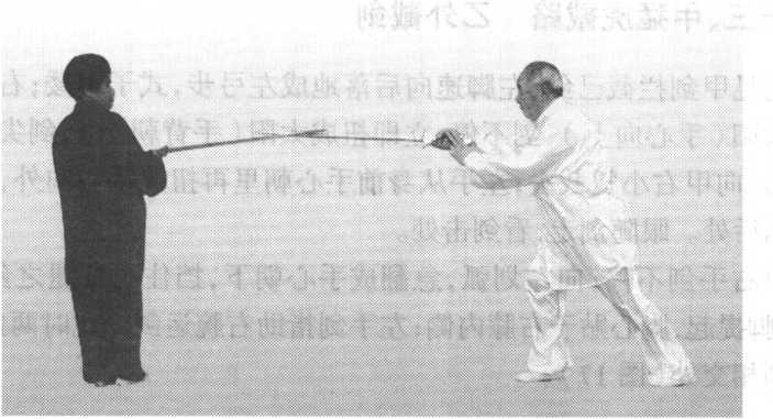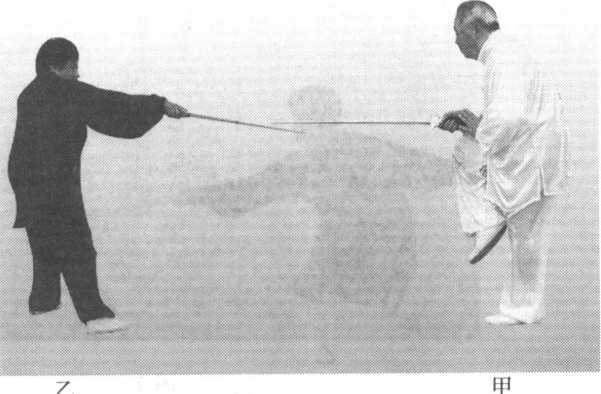 甲右手剑向里裹成中阴中阳(虎口朝上),左手扶在右腕上,剑往回收, 剑首抵于小腹;右脚悬于左脚内侧,眼看对方。然后急速直刺乙腕;同时右脚 迈出成弓步;左手扶在 右腕上,上身挺直。乙右手剑向里裹成 太阳(手心朝上),将剑 抽回,左手剑指下落,手 心册住剑首;右脚同时撤 到左脚旁,脚掌着地,两 腿微屈,眼看对方,此式 以躲甲刺下之剑(图18、图 19)〇 。 图 18乙 甲图19孙式太极拳诠真甲以“青龙缩尾”和“黑虎出洞”两式连续向乙进击,乃是一缩一伸,速 度应快,方显严密。孙式太极拳诠真