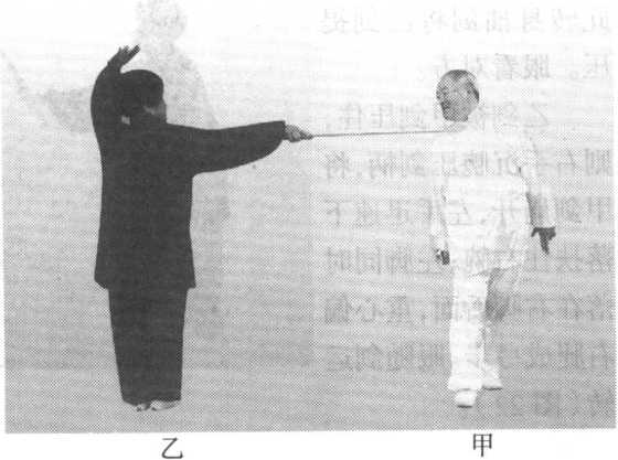 图24乙右脚向右前方迈出; 右手剑中阴中阳(虎口朝 上)刺向甲左肩;左脚跟 步;左手剑指抬至左额上 方,手心向外,眼看剑尖。图24甲动作同十八式乙之 鹞子束身,避开乙刺来之剑 (图 24) 〇178178