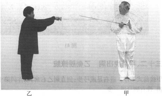 乙趁甲未稳,快速用右前臂向里裹转,边裹转边向下、再向上划一圆圈, 剑把由老阴变成中阴中阳,向甲之右腕劈去,臂要直,力达剑刃,裹腕时要坠 住肘;左手于剑动的同时,向前扶在右腕上;右脚向前跨步,左脚跟步,与右 脚齐,腿微屈,身子直立。图43甲见乙剑劈来,急用怀中抱月式避开。动作同第三十一式乙之怀中抱月 (图 43)。图43