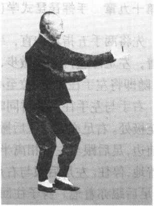 亦往回撤,撤至右足前边落下,两手仍伸 住,不可移动。两足往后撤时,身子之形 式,各处之劲,虚灵之情,两足相离之远 近,均与第十二章手挥琵琶式相同(图 23)〇