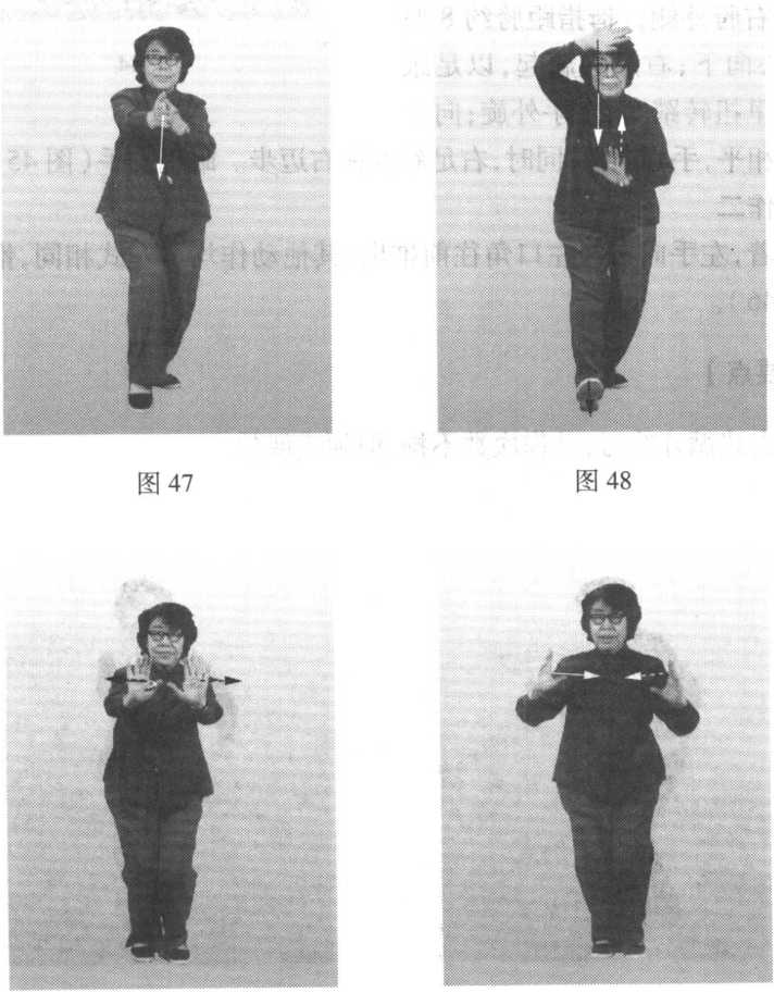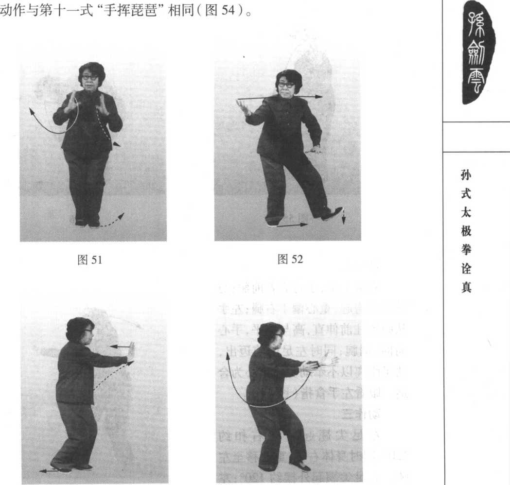 孙式太极拳诠真动作与第十一式“手挥琵琶”相同,惟方向相反(图47 )。?第二十六式白鹤亮翅动作与第七式“白鹤亮翅”相同(图48、图49 )。第二十七式开手 动作与第三式“开手”相同(图50 )。第二十八式合手动作与第四式“合手”相同(图51)。第二十九式搂膝糊步(左式)动作与第十式“搂膝拗步”相同(图52、图53 )。第三十式手挥琵琶(左式)