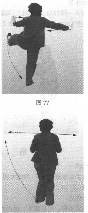 接前式。右足和身体微向 左转,随即左足踢起,脚尖回 勾向左前方蹬出;两手分开, 手足相交。眼看左手食指(图 79)〇