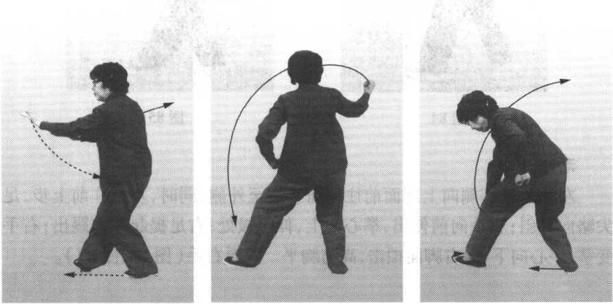左足向前迈步,足尖里扣;同时,左手内旋变拳,向下拉至左胯前;右手 外旋变拳,向后、向上、向前划弧,经前额向左内踝部打出;身体随着往下,左 腿屈膝,右腿微弓。眼看右手(图82、图83)。