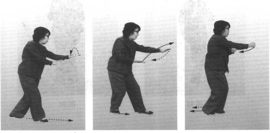 左脚上步,足尖要直;同时,左手内旋,手心向下,随即两手变拳,右拳往 前打出,拳眼向上,左拳收至右肘下,拳心向下;右足跟步至左足后,足尖着 地。眼看右拳(图97、图98)。图96 图97 图9$