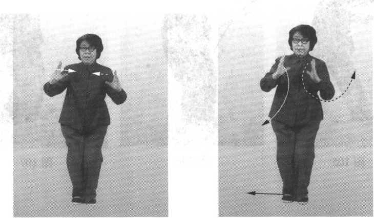 向上;右手搂至右肋前,手心向下(图96)。 动作二