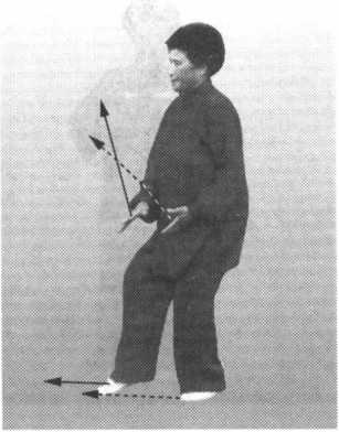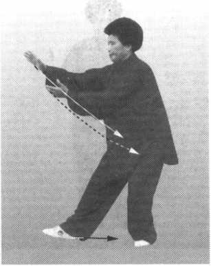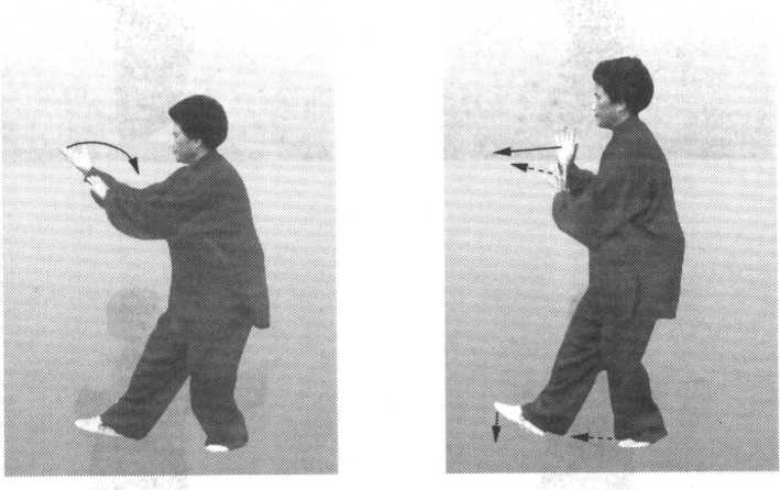 然后,两手自右肩处一起往前推出,两臂略弯曲;同时,右脚尖逐渐着 地,左脚也随着跟至右脚后约二三寸处。眼看右手(图31)。