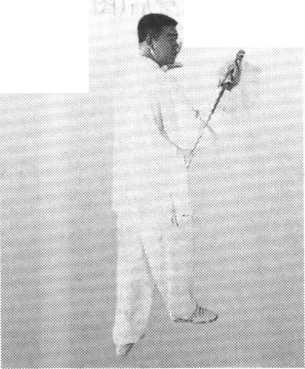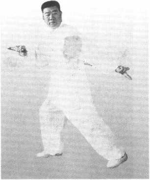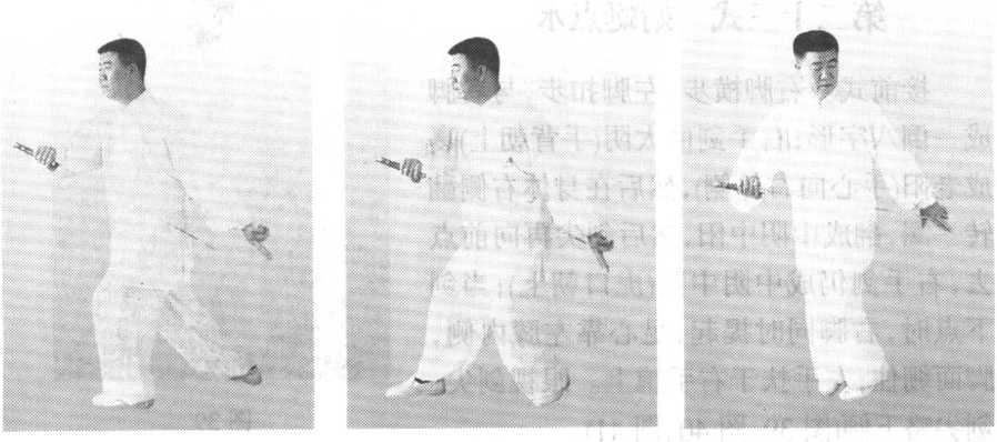 接前式。头向右扭转成向前看,手与剑不动;左脚先迈出,如自然行走,走三步时,左脚外摆。在行步时虽不回头, 但应全神贯注身后(图43、图44、图45)。第二十五式败势