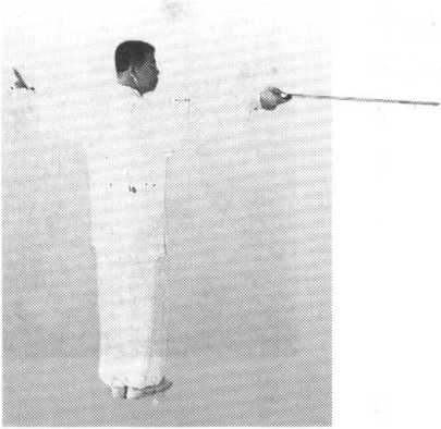 接削式。左手从右肋下向左穿去,手 背向上,穿到身后再将手心翻向上;右手 剑成太阴(手背朝上),直往后拉,右臂成半 圆形,仍手背朝上;眼顺剑尖往后看;当右 手拉剑的同时,右脚向左脚右后方落去, 成弓步,剑与胸平(图42)。