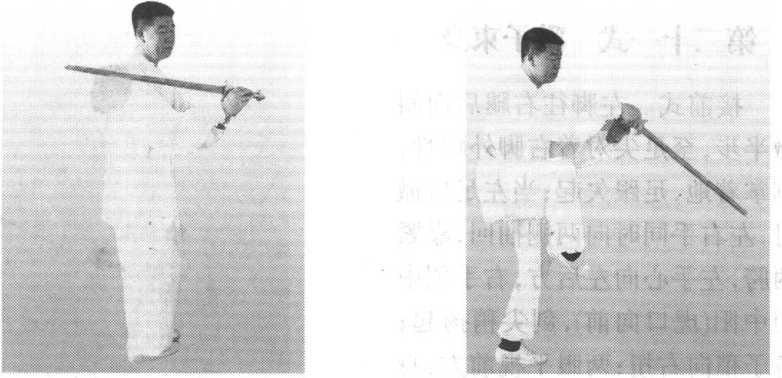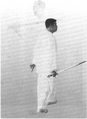 接則式。左脚往右腿后面斜 撤半步,至足尖对着右脚外踝骨, 脚掌着地,足跟欠起;当左足后撤 时,左右手同时向两侧抽回,靠紧 两跨,左手心向左后方,右手剑中 阴中阳(虎口向前),剑尖稍扬起; 身子稍向右扭;两眼平视前方,身 子仍斜着(图37)。