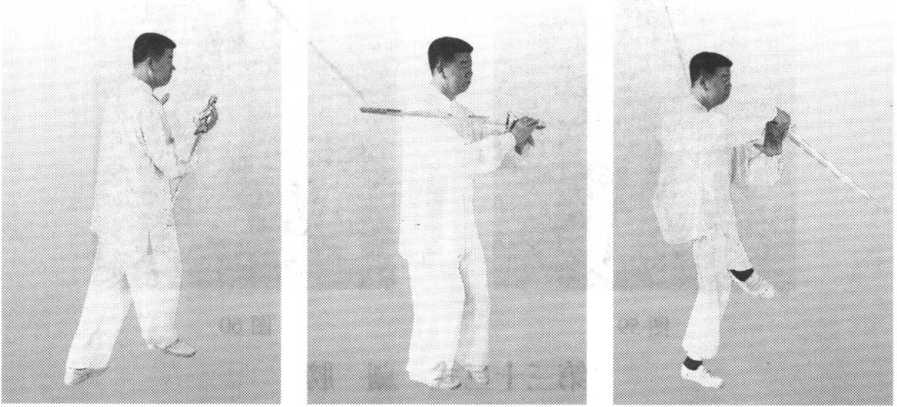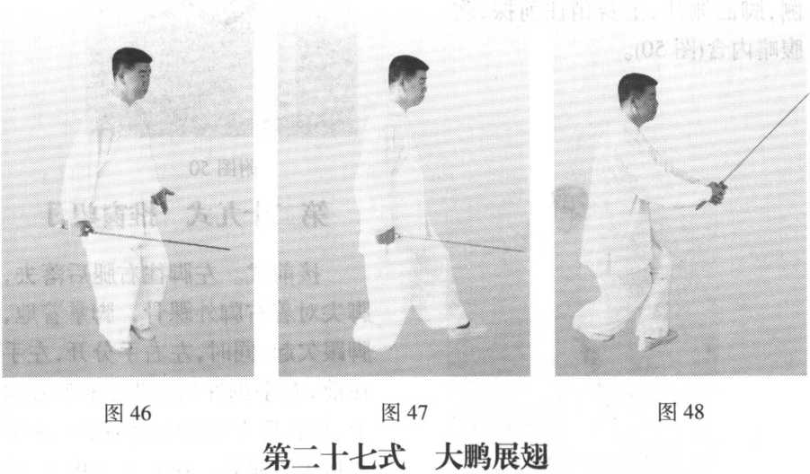 孙式k极拳诠真接前式。两臂向左右分开,同时身体渐起,两手手心向上,两手与胸腹之 间相齐,如展翅起飞之状,剑尖低于手;重心移至右腿,眼看前方。此为过渡 动作,速度应快,不停式(图49、图49附图)。