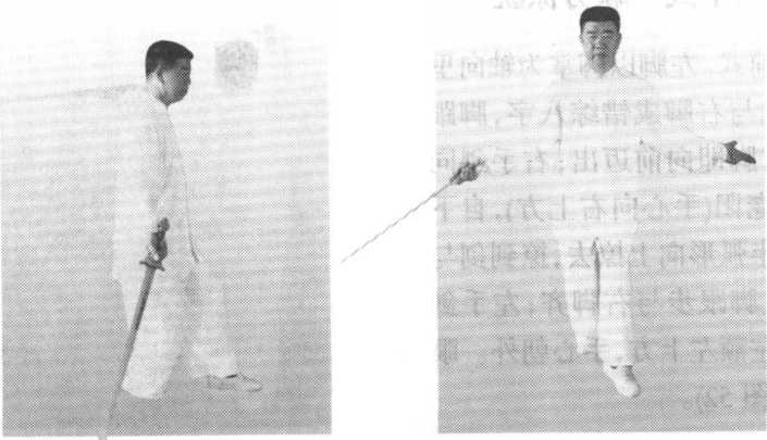 接前式。右脚扣步,身向左后转180°,左脚横着向前垫步,脚落地与右脚 成错综八字形,右脚随之稍跟步,右膝抵住左膝窝处,身体下蹲;左手与右手 剑都裹成太阳(手心朝上),当左脚垫步迈出时,两手向前上方横截去,两手相 交,左手心托住右手背,手与眼平,剑身斜向前上方(图46、图47、图48)。