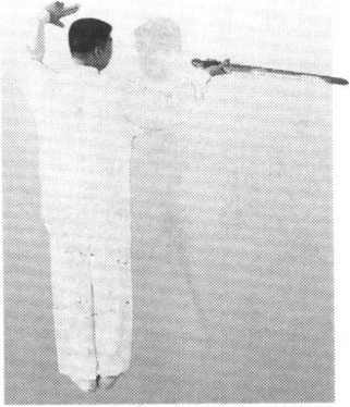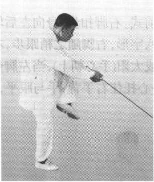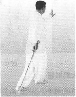 附图50接前式。两手向里合拢,剑向 左下方截去,剑尖下垂,左手心托 住右手背,两手手心向上;当截剑 时,左脚同时提起,脚心靠右膝内 侧,脚面绷住,上身稍往前探,胸 腹略内含(图50)。