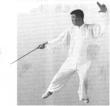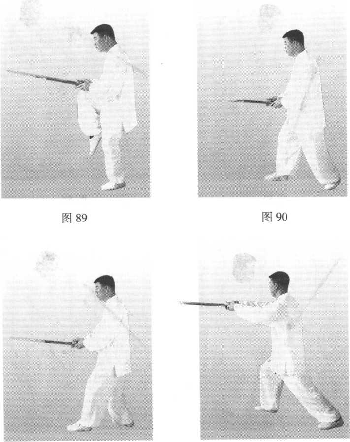 接前式。右腿向前落步,随即左腿向前迈一步,左脚落地后再向前垫跳 半步,右足再立即迈向前方,成右弓步,当右足落地时,将剑向前直刺出去, 手成中阴中阳(虎口朝前,剑刃垂直),左手扶在右腕上,剑与前臂平;眼看剑 尖;上身微向前倾,腰塌住劲(图90、图91、图92)。