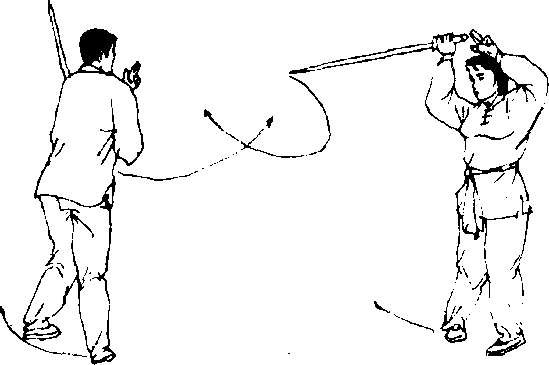 甲转走半个圆圈后,右脚在前,左脚扣步与右脚 成倒八字形,同时右手剑老阳着向左膀削去,挡开对 方之剑。右手直落至左大腿根部,左手与剑动同时边 裹边落至脐部再于制剑同时向上穿,上穿时手心朝向 面部。剑不停由身体左侧自下往上老阴着撩向对方 右腕。撩剑同时右脚后撤,两腿成歇步,右脚尖着地, 重心在左脚。(图121.122)