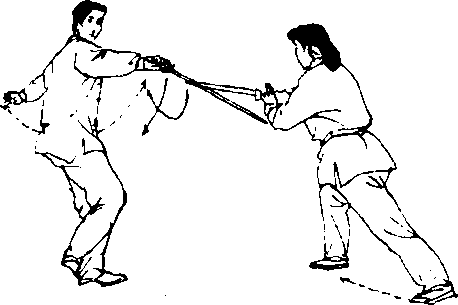 乙接前势,转走半个圆圈时,左脚扣步与右脚成 倒八字形,右手剑剑柄稍沉至胸部成老阳,左手同时 扶于右手腕。剑柄继续沉至腰部,右手剑老阳着向 前、向上刺向对方咽喉,右脚同时前迈成弓步。