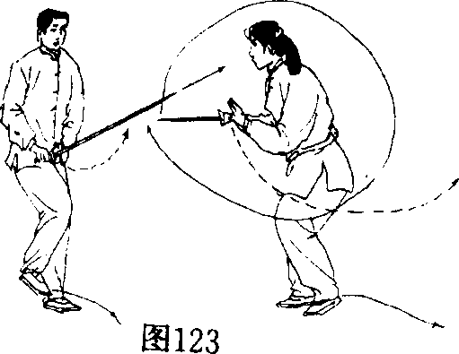 乙右脚回撤至左脚旁,脚尖点地,同时右手剑里 裹成老阳式(手心朝上),抽回到胸前,左手心抵住剑 柄,眼看对方。(图123)
