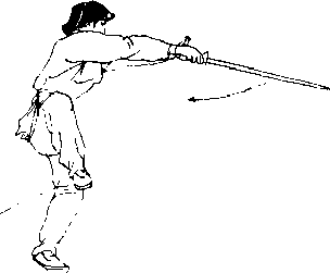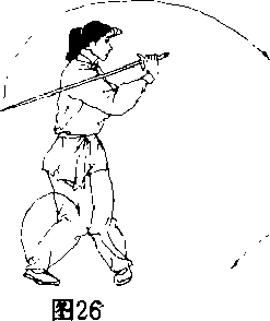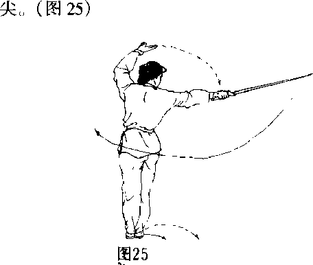 朝上八势不停右手剑在身体右侧手腕翻转剑尖向下向后划一立圆将剑翻成中阴中阳(立剑再用腕力使剑尖向前点刺门当剑点刺时右腿同时提起脚心扣在左膝内上侧脚面绷住成提膝独立步左手下落扶于右手腕上眼看剑尖口(图26、27)