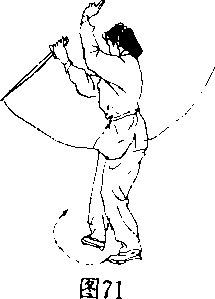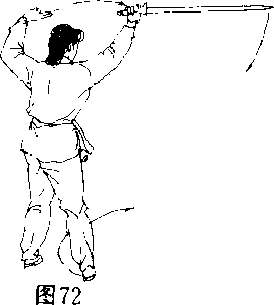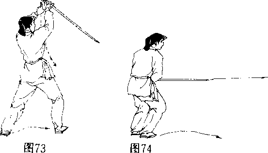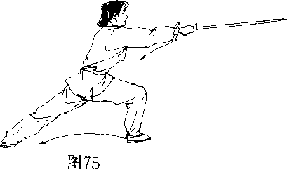 动作说明均同第32势口(图7072)图7057 鹤子入林接前势右脚停住左脚扣步与右脚成倒八字形顺势右手剑将剑把上提,剑尖向下再向前刺去右手持剑手心朝里随落随外扭成中阴中阳式(立剑),走剑时先斜下再平刺如划一小弧形剑刺出后剑与臂平左手扶于右腕上右脚随剑前刺时向右前方迈出成弓步口眼看剑尖(图734、75)要点右脚向右前方迈出和右手剑先斜下向右刺出的时间与方向均相同口剑把上提时,注意不要耸肩口58 怀中抱月接前势右脚撤至左脚旁脚拿点地右手剑向里裹成太阳(手心朝匚)右手剑平抽回至胸前左手手心抵住剑首凸其他动作要求同第37势,但方向相反口(图76)