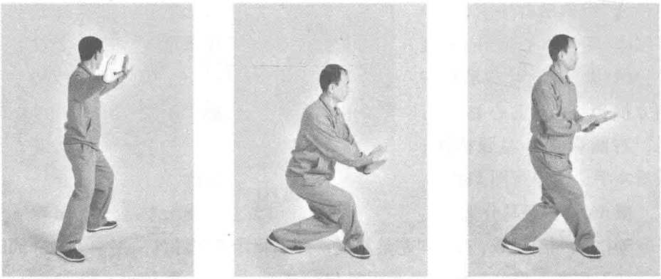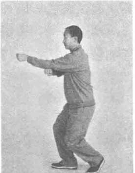 图111 图112图111 图112动作1:接前式,右足向左足靠拢,两足相距二三寸许,足掌着地;同时 右手向下划弧至腹前;眼看左手(图113)。
