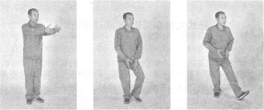 动作2:两手慢慢下落至腹前;随手下落,两腿慢慢弯曲,身体重心移至 右足,左足跟随着慢慢提起(图4)。