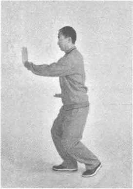 拳式要求:左足向前迈时,右足要蹬劲,以催动全身。两手前推有如推