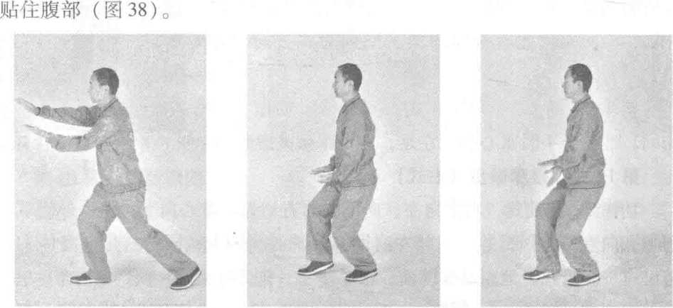 动作2:动作不停,左足全足落实,重心移至左足,右足撤至左足前,足 掌着地,成右虚步;同时两手一齐往下划弧至腹前,左手腕贴住腹部(图 37) o