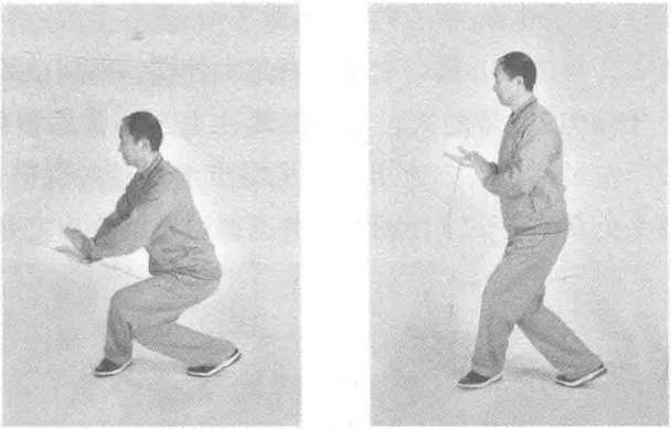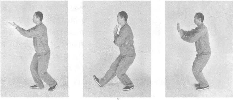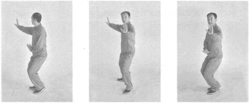 拳式要求:腰要塌住劲,上体保持正直,不可歪斜,重心向后转移时要 靠身体纵轴和腰部的螺旋带动手臂的弧形运动。